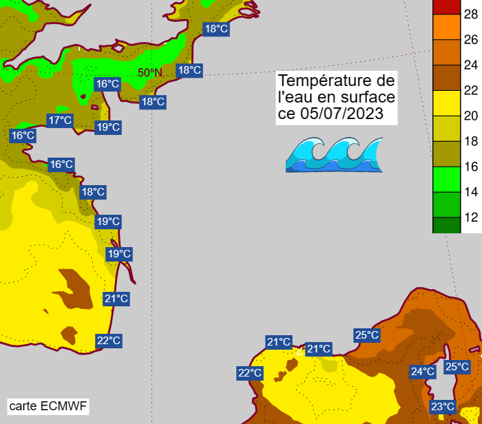 Température de l'eau de mer en surface au mercredi 5 juillet 2023 - via ECMWF