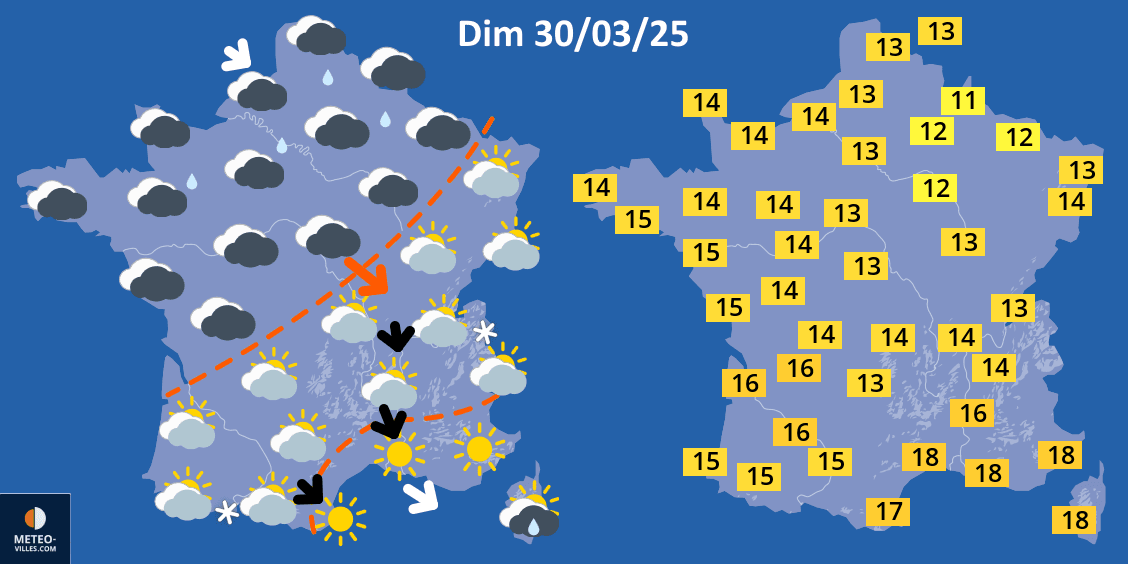 Une accalmie concernera le sud et l'est dimanche 30 mars 2025 avec toujours du soleil en Méditerranée mais avec un mistral et une tramontane soufflant fortement. En revanche, un front très atténué va s'échouer sur un large quart nord-ouest de la France, amenant grisaille mais très peu de pluie. Les températures maximales atteindront 12 à 14°C au nord, souvent 15 à 16°C au sud-ouest et 17 ou 18°C en Méditerranée.