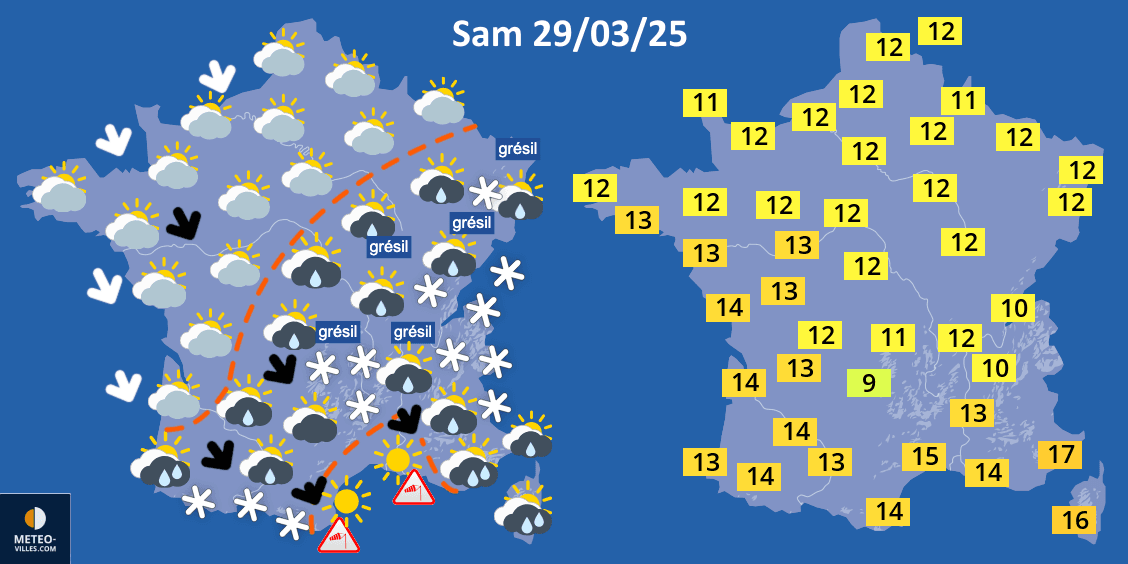 La journée du samedi 29 mars 2025 sera très mitigée avec des nuages majoritaires sur la plupart des régions. Ils apporteront quelques averses du sud-ouest aux régions de l'est, se bloquant sur les reliefs où elles seront plus actives, notamment sur le Jura, le nord des Alpes et les Pyrénées. Le golfe du Lion aura droit au soleil mais au prix d'un mistral et d'une tramontane violents. Les températures vont reculer avec une accentuation de la fraîcheur. Les maximales vont plafonner entre 10 et 14°C sur la plupart des régions, atteignant jusqu'à 17°C sur la côte d'Azur.
