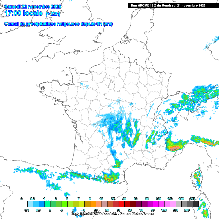 Évolution de l'épaisseur de neige au sol prévue par le modèle météo ARÔME entre samedi 17h et dimanche 11h - METEOCIEL