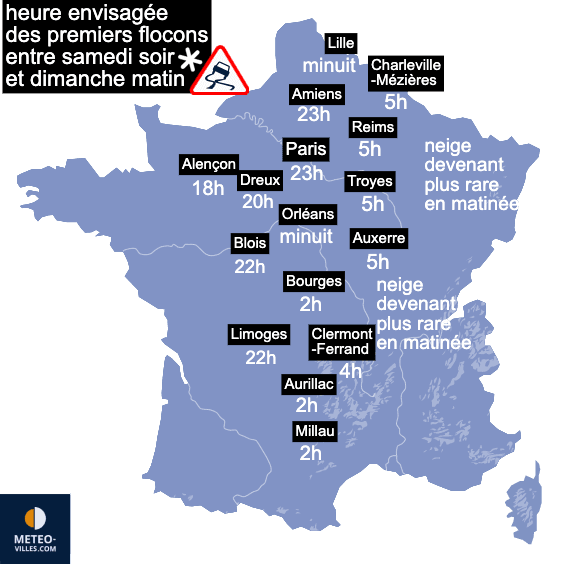 Le département de l’Orne sera probablement la première zone à connaître des chutes de neige samedi en début de soirée. Par la suite, la zone de neige s’étendra progressivement à mesure que les précipitations progresseront dans l’air froid. Entre 20 heures et 22 heures, des chutes de neige sont prévues entre Dreux, Blois et Limoges. La neige aborderait ensuite l’Île-de-France et la Picardie par l’Ouest à partir de 22 heures