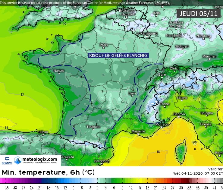 Le froid plongera jusqu'au sud-ouest de la France en matinée du jeudi 5 novembre avec la possibilité de quelques gelées blanches localisées. Le risque sera plus net sur le nord et le centre de la France, à l'image de la veille. C'est entre la Normandie, l'Île-de-France, les Hauts-de-France et le Grand-Est que les gelées blanches seront les plus fréquentes. Par endroits, le thermomètre pourra descendre sous le zéro (notamment en campagne).