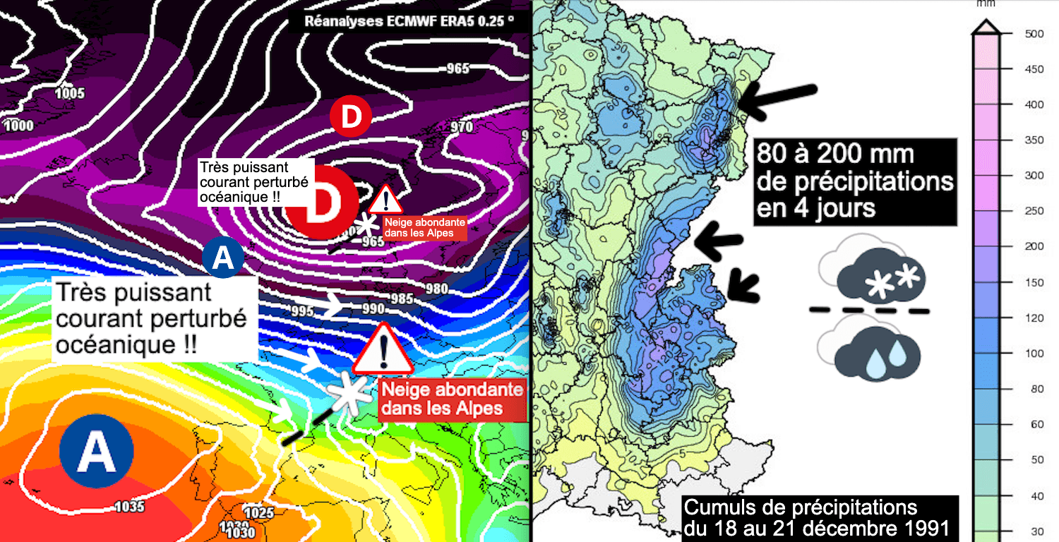 Dès la mi-décembre 1991, un très puissant courant océanique perturbé frappe de plein fouet toute l'Europe occidentale. L'imposant massif alpin ainsi que le Jura et les Vosges forment un obstacle à la progression des précipitations qui viennent se bloquer et se déverser sur ses reliefs. Le 20 décembre la neige tombe à des altitude relativement basse car l'isotherme 0° se situe aux alentours de 700 m. Mais progressivement, la masse d'air se radoucit et la neige se transforme en pluie jusqu'aux environs de 1500 m d'altitude entre le 21 et le 22 décembre.
