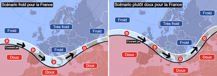 Comme évoqué précédemment, pour un véritable retour du froid, il sera nécessaire que la France soit située au nord du courant jet et donc du défilé de dépressions, ce qui permettra au flux de prendre une dominante nord voire nord-est. Si par contre le courant jet se déplace plus au nord, alors nous pourrions au contraire nous retrouver sous une influence océanique plus perturbée mais surtout plus douce.