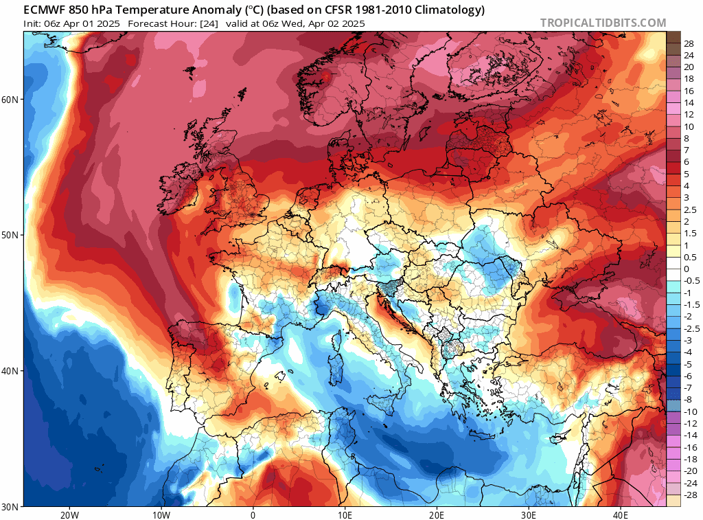 Anomalie thermique de la masse d'air du mercredi 2 au samedi 5 avril 2025 - tropicaltidbits.com