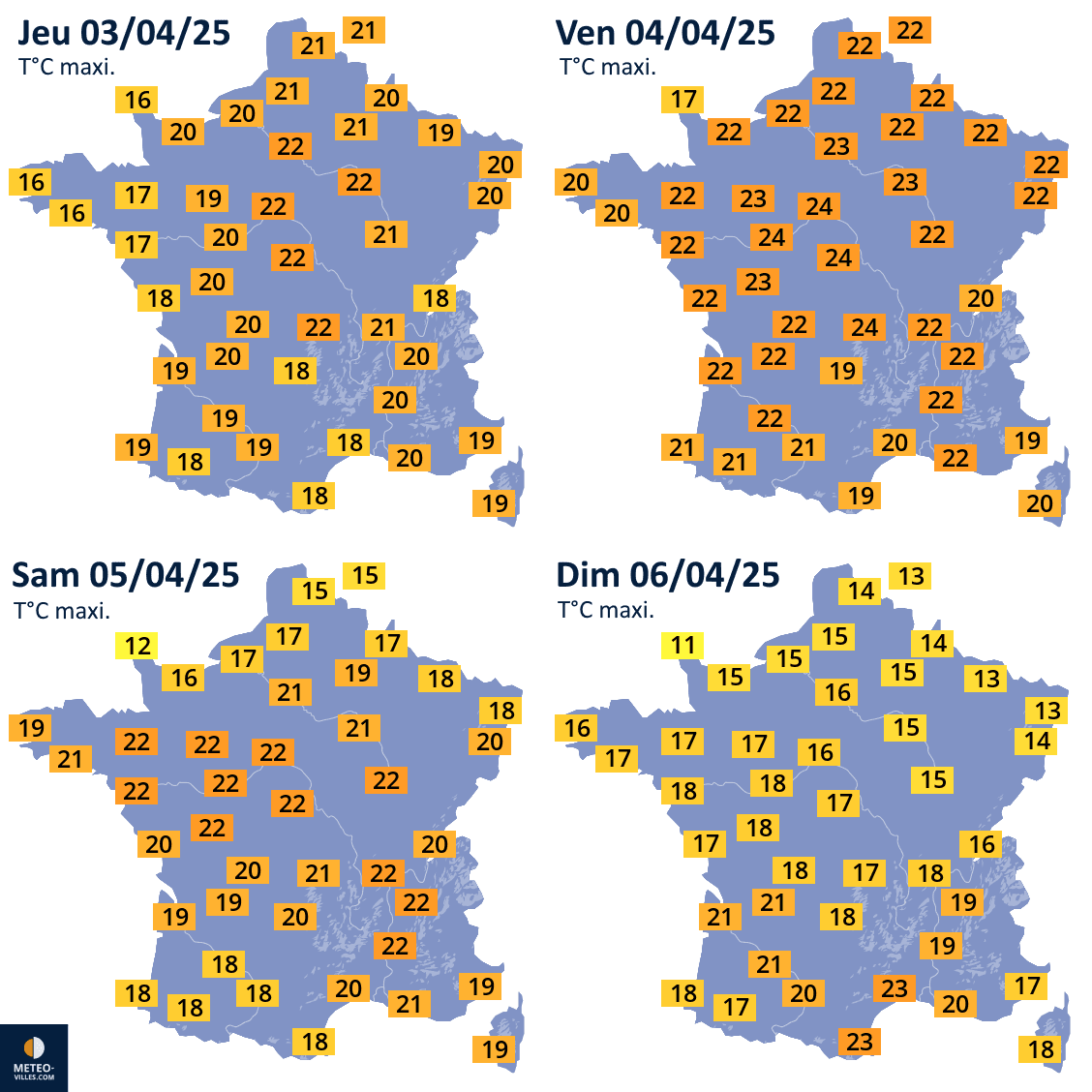 Températures maximales prévues du jeudi 3 au dimanche 6 avril 2025 - Météo Villes