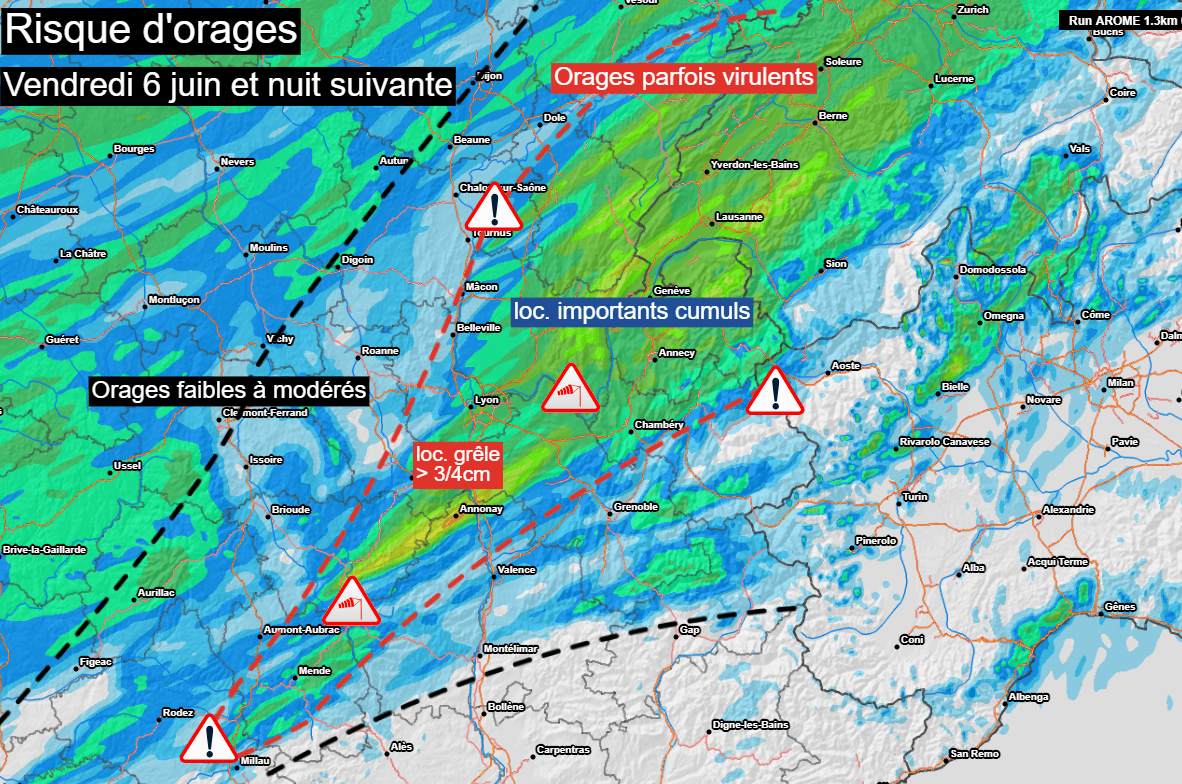 Risque d'orages parfois virulents sur le centre-est de la France ce vendredi 6 juin 2025 – Modèle arome via meteociel.fr