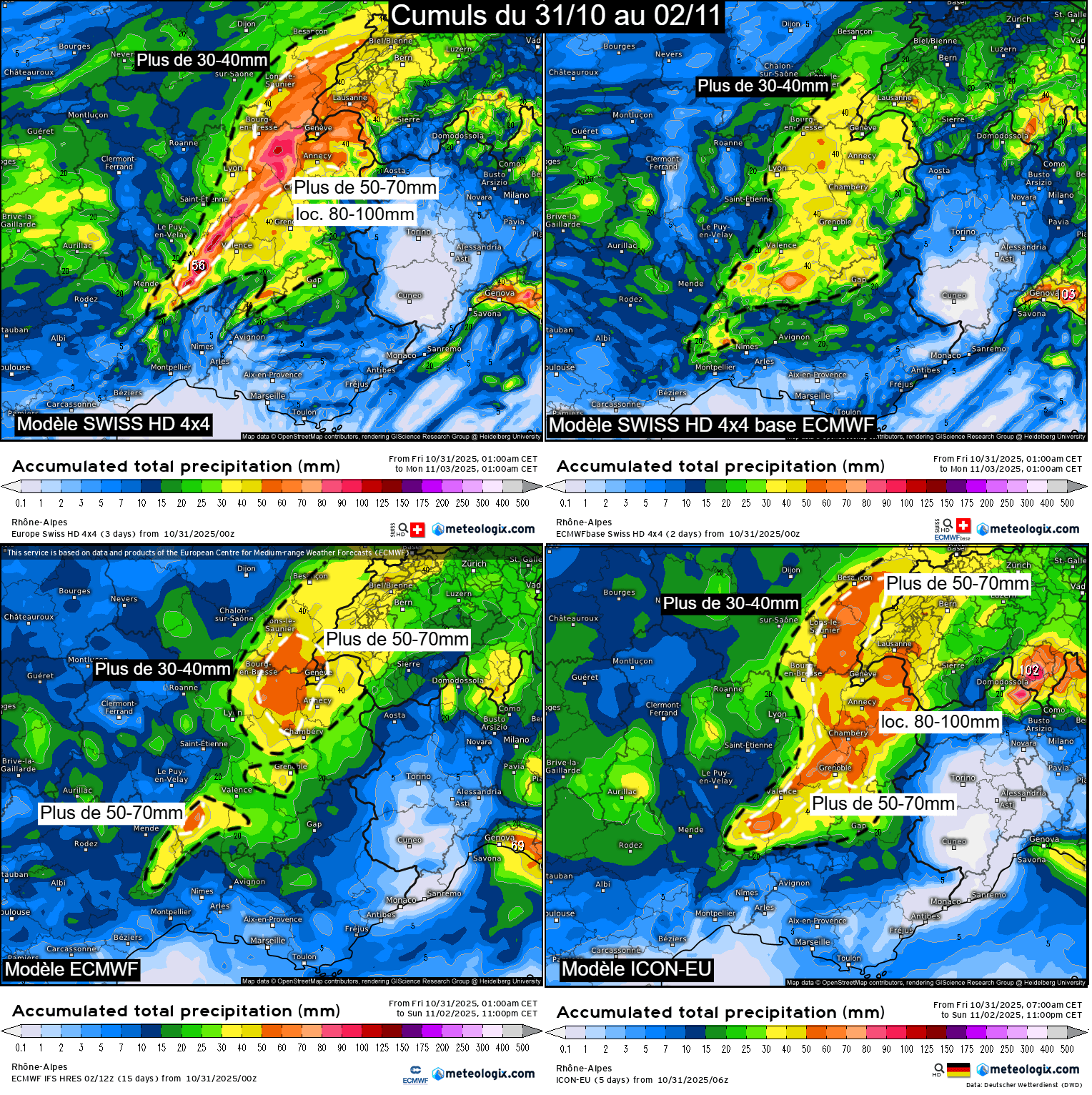 Des incertitudes persistent toutefois sur ces cumuls, ceux-ci pouvant aller du simple au double en fonction des modélisations. Certains scénarios envisagent par exemple de larges zones à plus de 70-80mm avec des pointes à plus de 90mm entre les reliefs ardéchois et l'Ain, tandis que d'autres restent plus raisonnables.