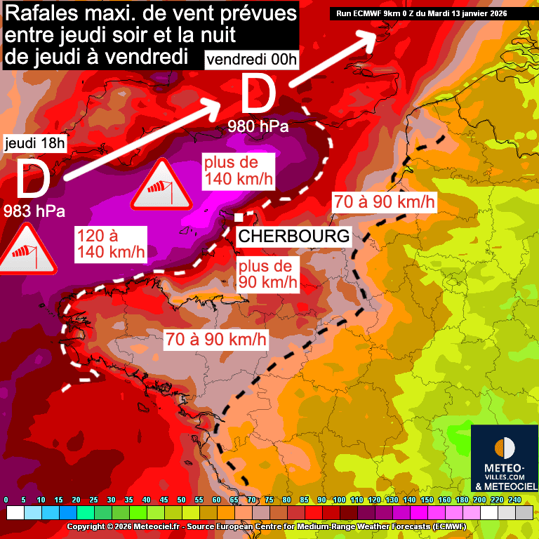 Jeudi soir, une dépression va rapidement se former au large de la Cornouailles, atteignant 983 hPa à 18h sur la pointe sud-ouest de l’Angleterre. Un gradient de pression particulièrement resserré se formera juste à l’arrière de la dépression, générant des vents très forts. Ces vents pourraient largement dépasser les 100 km/h sur une grande partie de la Manche. À minuit, la dépression se sera encore un peu creusée et se situera sur le sud de l’Angleterre, à la hauteur du Cotentin. Les rafales les plus fortes se produiront au sud de la dépression, avec des valeurs pouvant dépasser 150 km/h entre les îles Anglo-Normandes et l’extrême nord du Cotentin. Le cap à la Hague semble particulièrement exposé vers minuit.