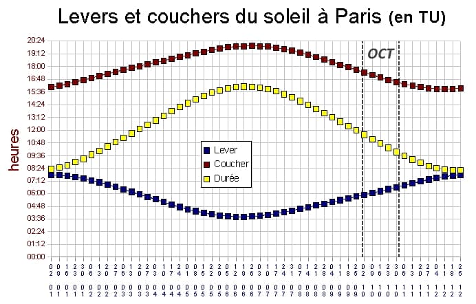 Durée du jour à Paris au cours de l'année (en temps universel)