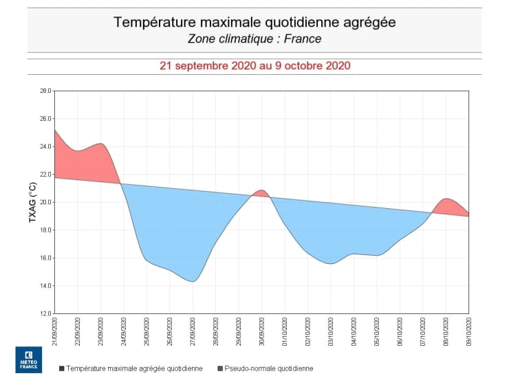 Anomalie des températures moyennes en France du 21 septembre au 9 octobre 2020 - via Météo France