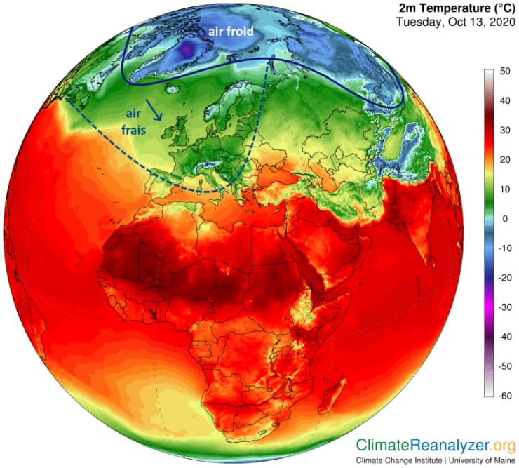 Températures à la surface du globe le mardi 13 octobre 2020 - via ClimateReanalyzer
