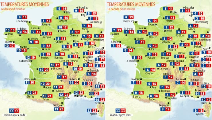 Températures moyennes en 1ère décade d'octobre et 1ère décade de novembre - lameteo.org