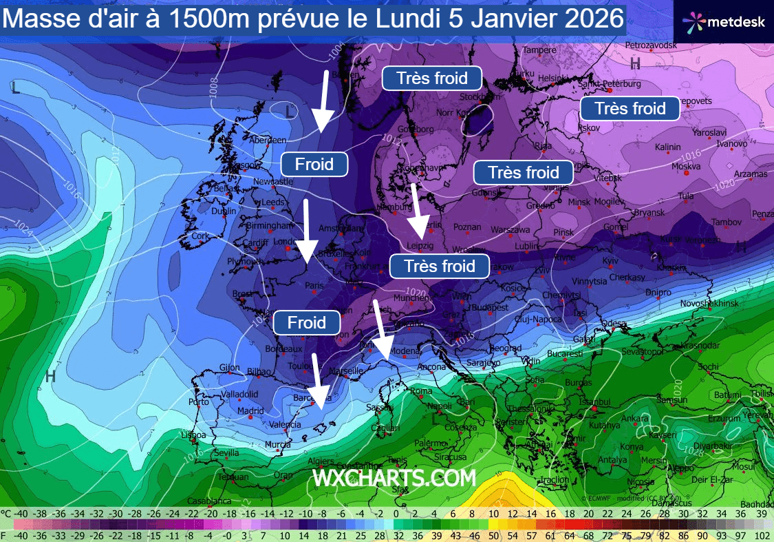 L'hiver prend ses quartiers et ne fera que s'affirmer au cours des premiers jours de l'année 2026. En effet, un flux de nord va se mettre en place et une dépression stationnant au dessus de la Mer Baltique se chargera de nous amener un air venu des régions polaires, plongeant de la Scandinavie et de la Mer de Norvège en direction de la France. En début de semaine prochaine, les modèles envisagent une température de la masse d'air autour des -10°C à 1500m d'altitude dans l'est de la France, des niveaux flirtant avec ceux autorisant une vague de froid.