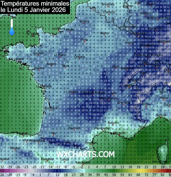 Températures minimales modélisées pour le lundi 5 janvier 2026 - wxcharts.com