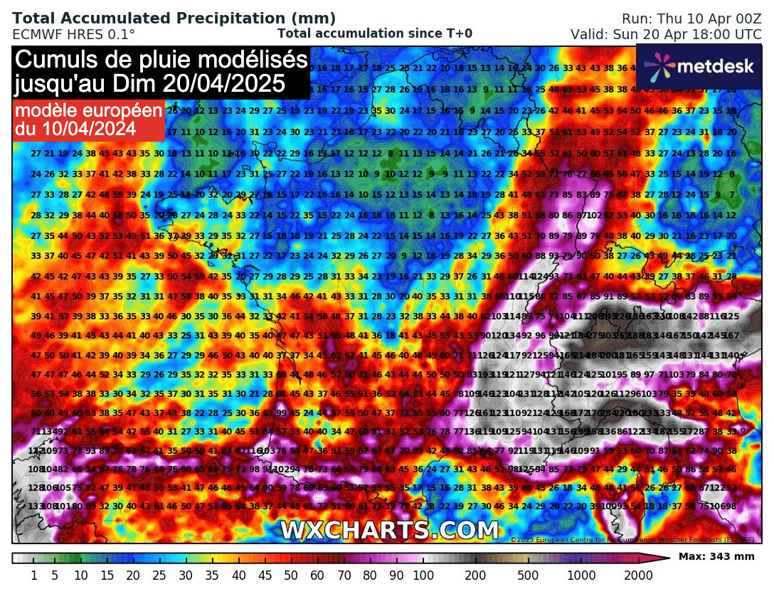 Cumuls de pluie envisagés jusqu'au dimanche 20 avril 2025 selon le modèle européen - wxcharts.com
