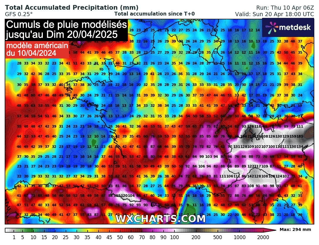 Cumuls de pluie envisagés jusqu'au dimanche 20 avril 2025 selon le modèle américain - wxcharts.com