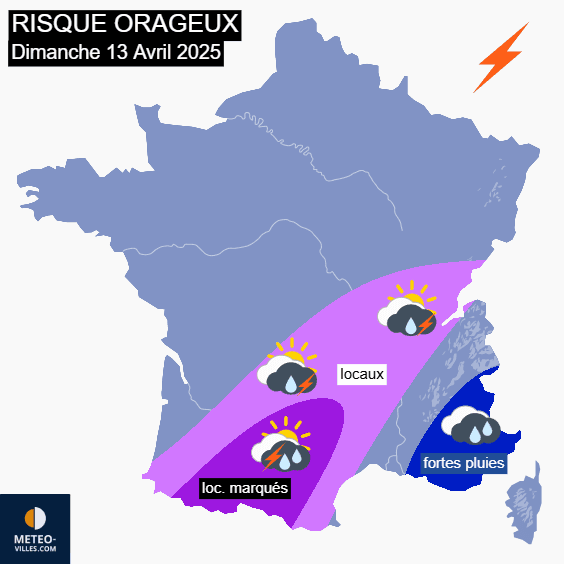 Carte du risque orageux pour le dimanche 13 avril 2025 - Météo Villes