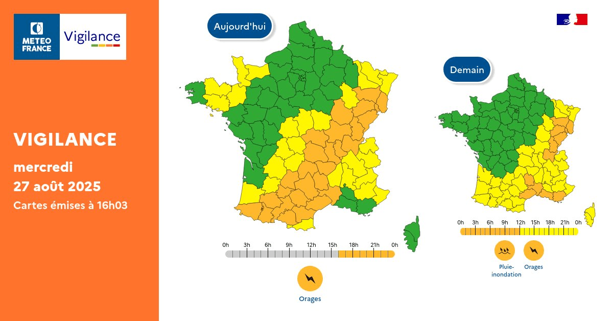 Les services de Météo France ont placé 30 départements en vigilance orange aux orages, valable pour ce mercredi 27 août 2025 et jusqu'à jeudi midi. Ces départements s'étirent des Pyrénées à la Franche-Comté. La dégradation orageuse n'épargnera pas la Méditerranée. L'alerte s'étend aux départements de l'Aude, de l'Hérault, de la Lozère, du Gard, des Bouches-du-Rhône et du Var où elle est valable jusqu'en matinée du jeudi 28 août. Sur les Bouches-du-Rhône et le Var, l'alerte concerne aussi le paramètre pluie-inondation.