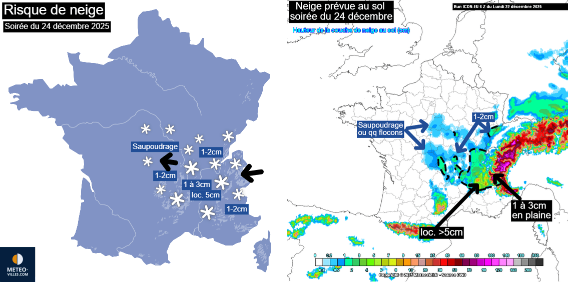 Comme évoqué précédemment, la goutte froide abordera l'est de la France en fin de journée du 24 décembre. Même si la prévision du risque de neige reste difficile en raison de quelques incertitudes, plusieurs scénarios évoquent la formation d'un petit front neigeux entre le Jura et les Alpes en soirée du 24 décembre, apportant des chutes de neige jusqu'en plaine sur ces régions.
