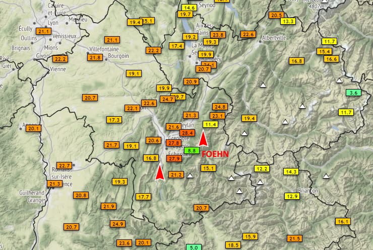 L'effet de foehn s'est fait sentir tout au long de la nuit et de la journée avec des minimales nocturnes de 20,2°C à Saint-Martin-d'Hères et 21,4°C à Grenoble-CEA ! En après-midi, c'est une véritable chaleur a envahi la vallée avec 27,4°C à Grenoble-CEA, 27,8°C à Saint-Martin-d'Hères, 27,9°C à Vizille et 28,0°C au Versoud !