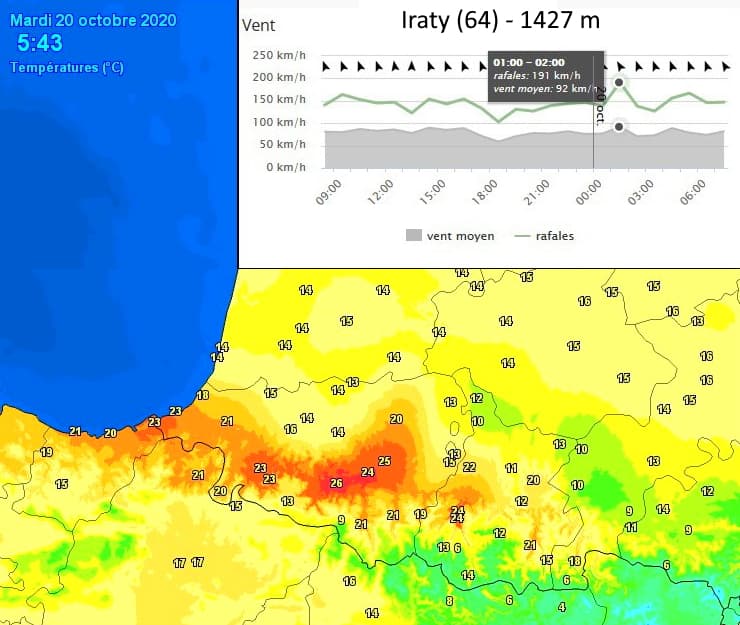 La particularité de l'effet de foehn est qu'il peut se produire à tout moment de la journée, y compris la nuit. Il a été observé durant la nuit du 19 au 20 octobre et celle du 20 au 21 octobre au pied des Pyrénées. En fin de nuit de lundi à mardi, les vents soufflaient à plus de 190 km/h à Iraty sur le relief des Pyrénées-Atlantiques. Pendant ce temps, le thermomètre s'envolait à 26°C dans le secteur d'Oloron aux alentours de 6h du matin, encore en pleine nuit !