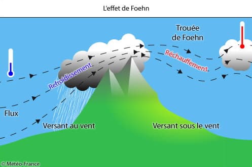 Pour qu'un effet de foehn se mette en place, il faut que le vent soit perpendiculaire au relief. En se heurtant au versant de la montagne exposé au vent, l'air va s'élever en suivant les pentes du relief et se refroidir rapidement. Lors de ce processus, l'air se décharge de son humidité. Dans certaines situations, un nuage et des précipitations peuvent se former. Une fois au sommet, l'air asséché va redescendre rapidement sur l'autre versant de la montagne en se réchauffant très rapidement.
