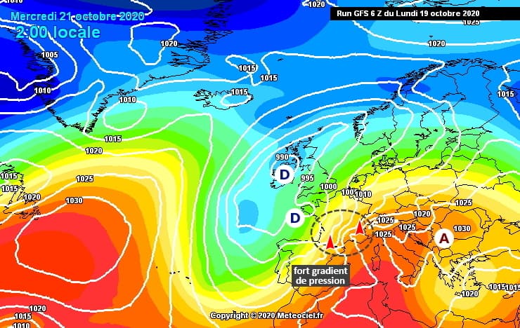 Mardi 20 et mercredi 21 octobre 2020, un flux très dynamique de secteur sud a concerné la France entre une dépression sur le proche-Atlantique et un anticyclone que sur les Balkans. Ces conditions étaient idéales pour observer un effet de foehn. En flux de sud, les Pyrénées sont particulièrement exposées à ce phénomène. C'est également le cas des pré-Alpes avec les vallées de l'Isère en première ligne ainsi que certaines vallées savoyardes.