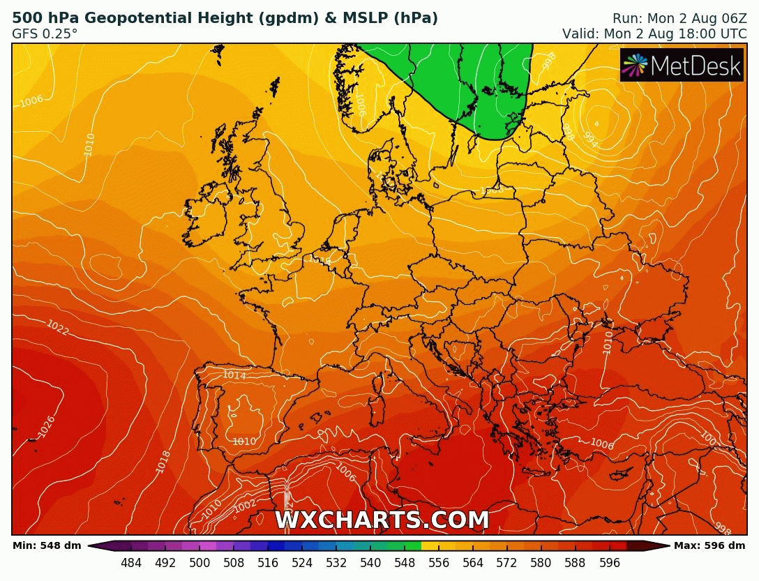 Animation des géopoptentiels sur l'Ouest de l'Europe du lundi 2 au dimanche 8 août 2021 – Modèle GFS via WX CHARTS