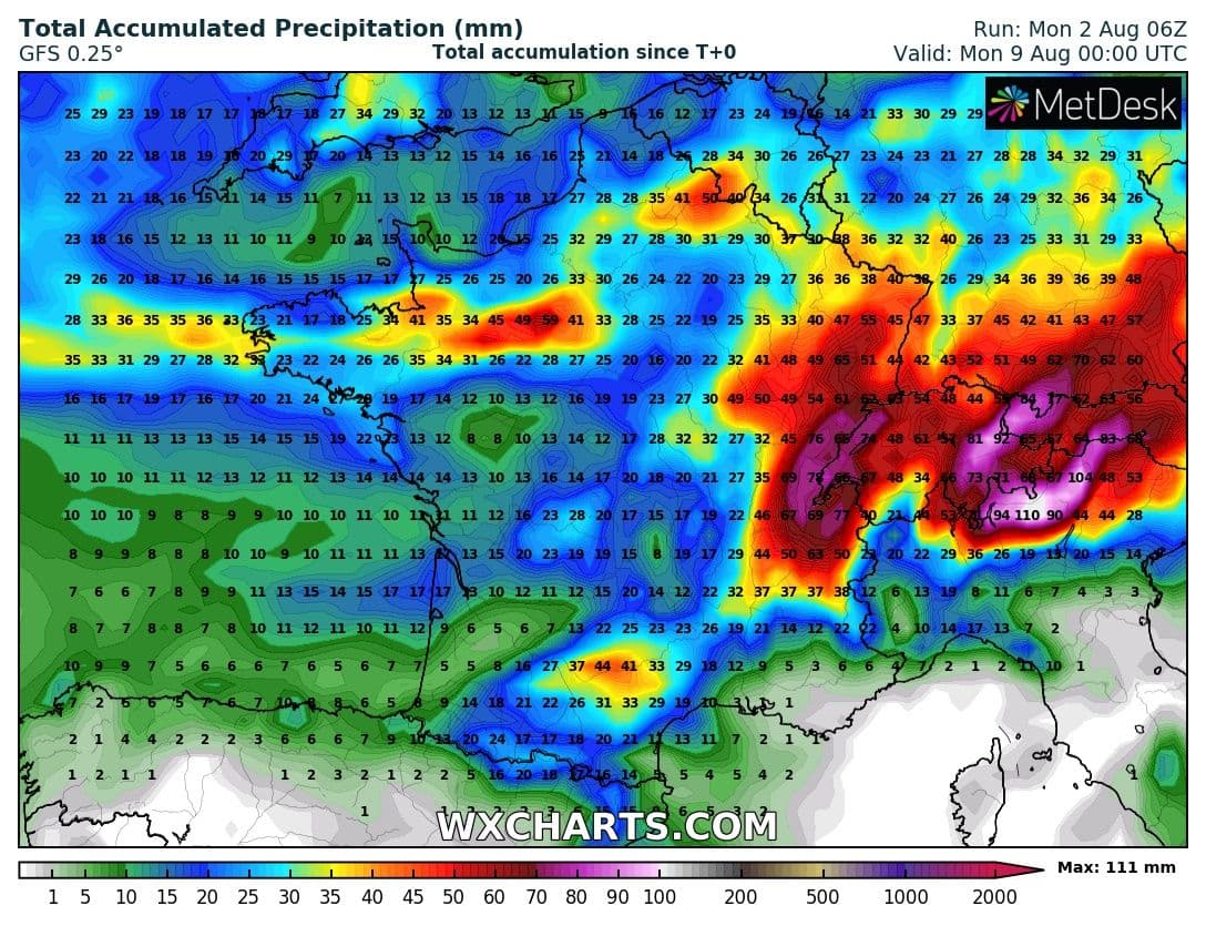 Cumuls de précipitations envisagés du lundi 2 au dimanche 8 août 2021 – Modèle GFS via WX CHARTS