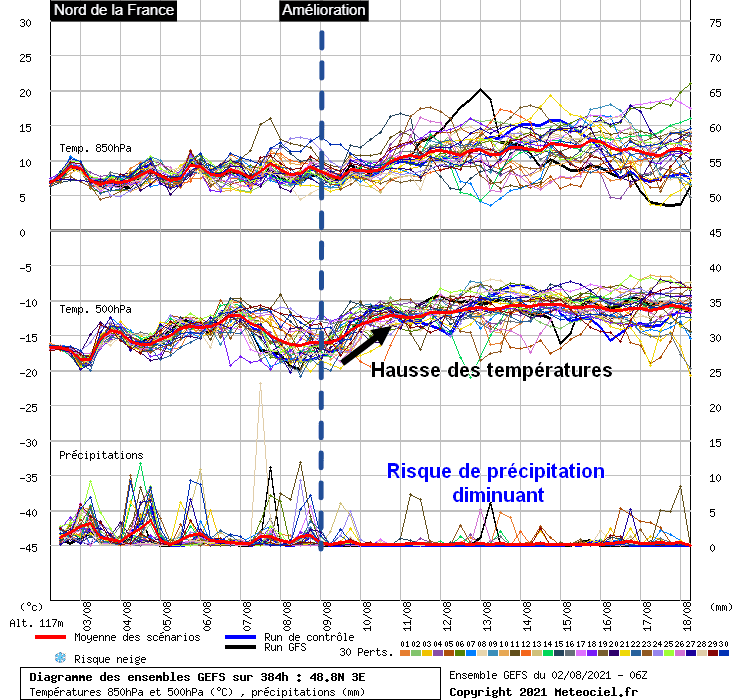 Diagramme de l'évolution des températures en altitude et du risque de précipitations sur le Nord de la France jusqu'au 18 août 2021 – Météociel.fr