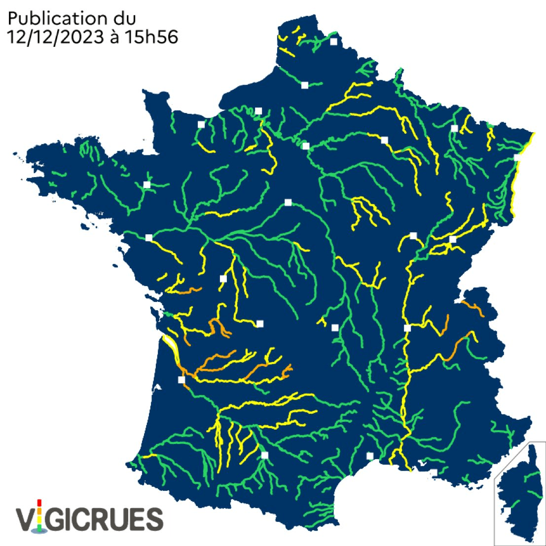 Carte de vigilance des crues au mardi 12 décembre 2023 à 16h - via Vigicrues