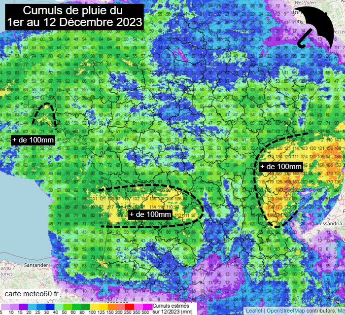 Cumuls de pluie du 1er au 12 décembre 2023 - carte meteo60.fr