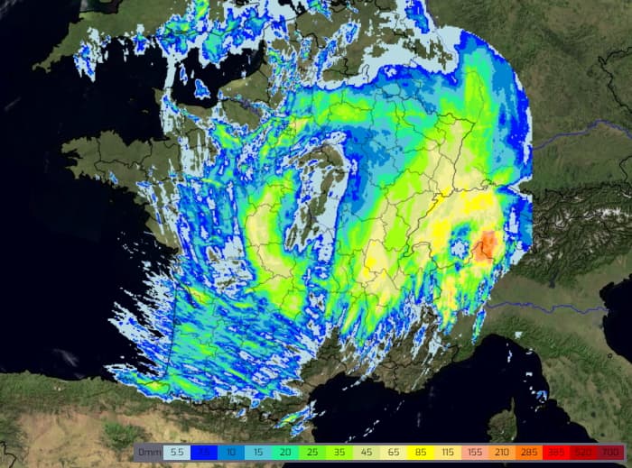 Le scénario du modèle européen est très proche. Il montre des pluies copieuses du Massif Central à la Champagne, de l'ordre de 20 à 50 mm. Sur l'est de la Franche-Comté, l'Alsace et la Lorraine, des accumulations de l'ordre de 70 à 100 mm sont également prévues avec des valeurs dépassant les 100 mm sur l'est de la Lorraine et le nord de l'Alsace, allant jusqu'à 175 mm sur le massif des Vosges !