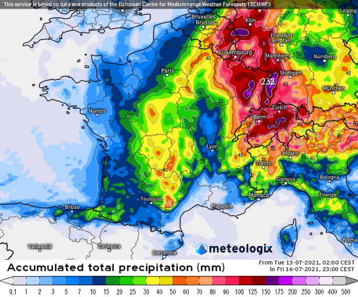 Cumuls de précipitations prévus jusqu'au vendredi 16 juillet 2021 au soir - modèle européen via meteologix.com