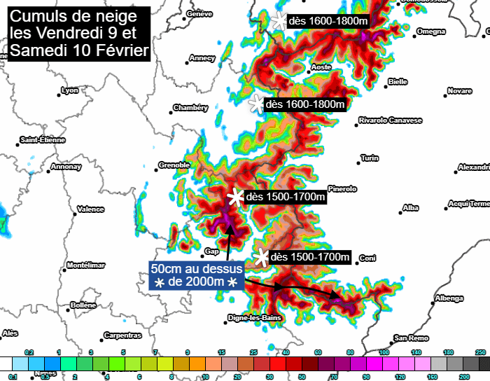 Cumuls de neige prévus dans les Alpes les vendredi 9 et samedi 10 février 2024 - carte travaillée par Meteo-villes via meteociel