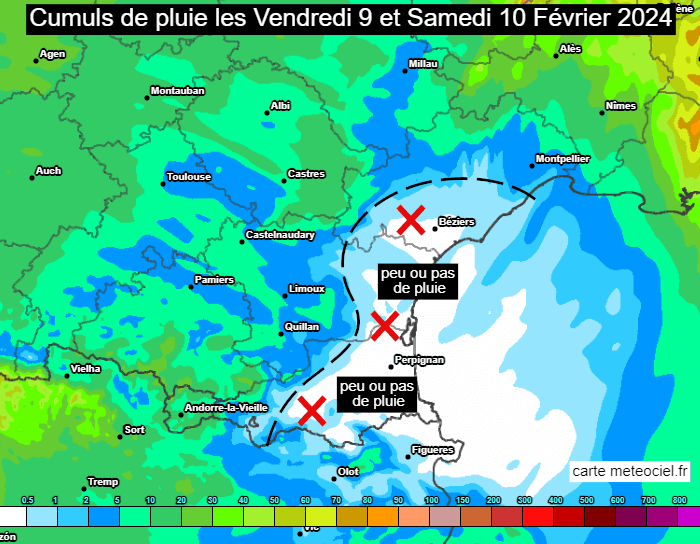 Cumuls de pluie prévus les vendredi 9 et samedi 10 février 2024 dans le Roussillon - carte travaillée par Meteo-villes via meteociel