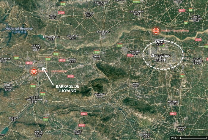 En plus des inondations qui sont survenues, les autorités redoutaient une crue majeure liée à un barrage menaçant de s'effondrer à Luoyang, en amont de Zhengzhou. L'installation a été dynamitée mercredi 21 juillet pour laisser l'eau s'écouler de façon contrôlée et limiter considérablement l'ampleur des inondations dans la vallée du fleuve Jaune, qui passe juste au nord de la ville de 10 millions d'habitants.