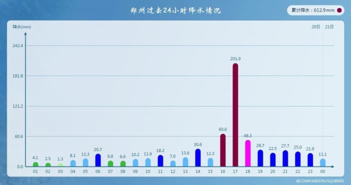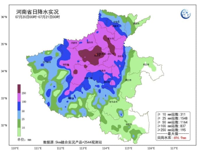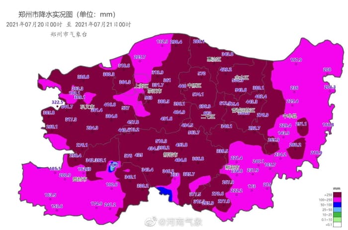 Les quantités de pluie qui se sont déversées sur la province du Henan ont été particulièrement importantes mais c'est véritablement sur le territoire de la ville de Zhengzhou qu'elles ont été les plus remarquables, dépassant de manière généralisée les 150 mm, allant même jusqu'à dépasser les 500 mm dans certains quartiers. La station la plus arrosée a reçu 696,9 mm, soit plus en 24h que ce qu'il tombe au cours d'une année entière (moyenne de 641 mm) !
