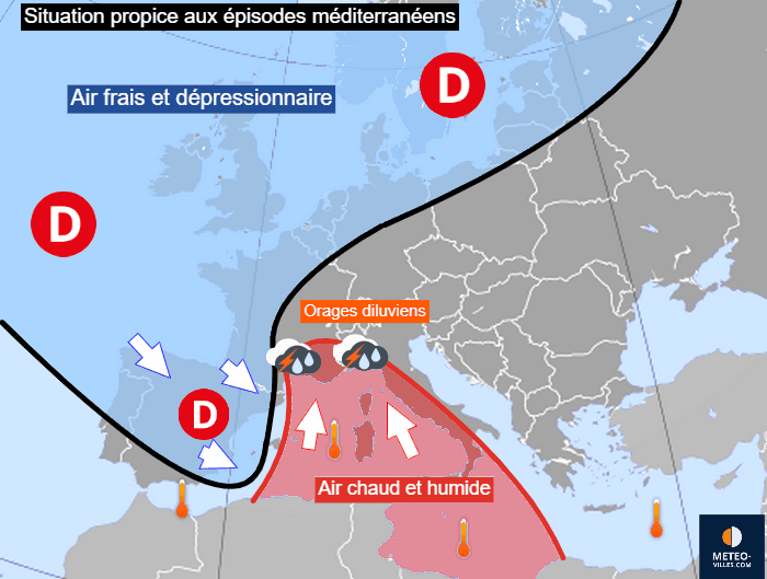 En général, ce type d'épisode se produit lorsqu'une zone dépressionnaire accompagnée d'air froid et humide s'avance vers la Méditerranée par la péninsule ibérique. L'arrivée de celle-ci engendre un basculement du flux au sud/sud-est près de la Méditerranée, ce qui a pour effet de faire remonter de l'air chaud et très humide vers le sud-est de la France, air chaud et humide qui rencontre ensuite l'air plus frais et dépressionnaire en altitude et qui favorise donc la formation d'orages parfois virulents.