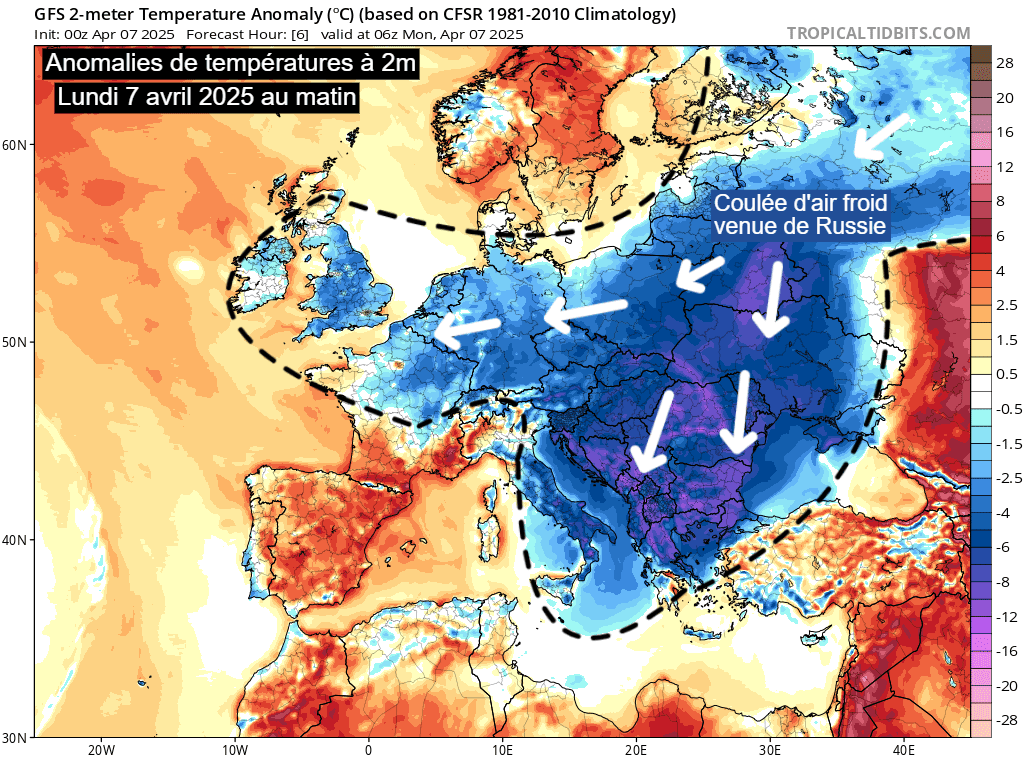 Anomalies de températures à 2m sur l'Europe ce 7 avril 2025 – via TropicalTidBits