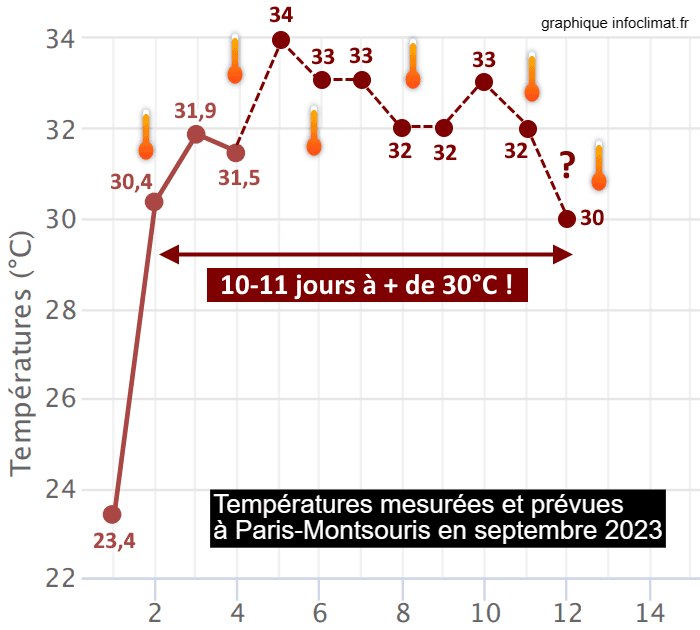 Températures mesurées et prévues à Paris en septembre 2023 - via infoclimat.fr & Météo Villes