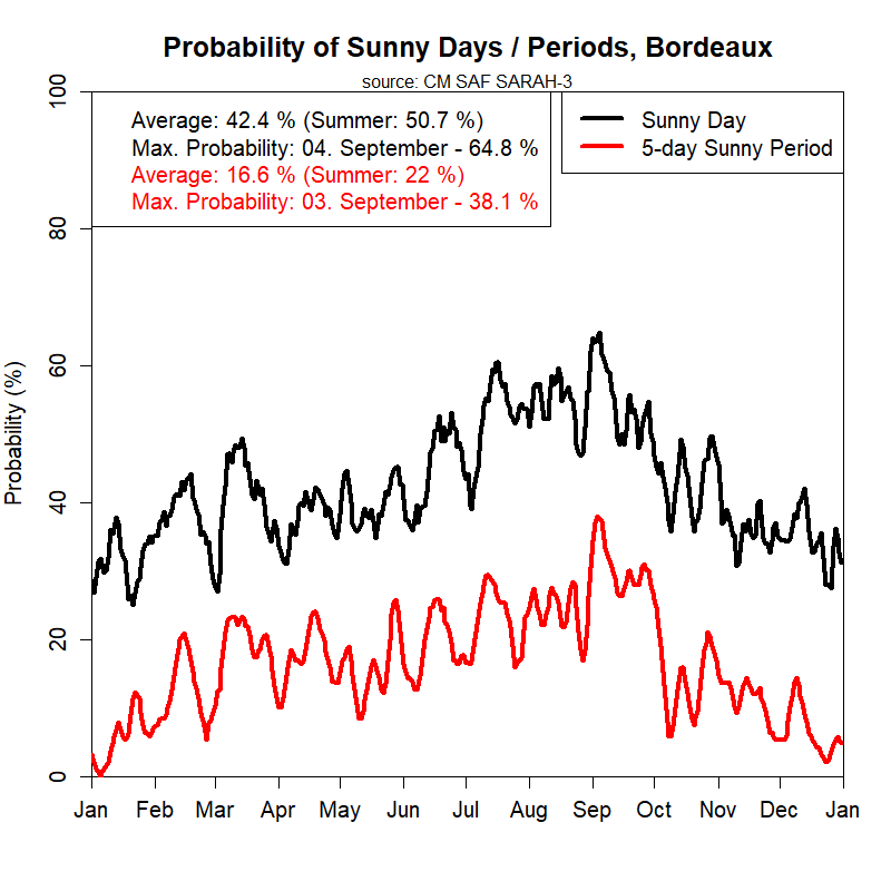 Probabilité d'ensoleillement (>5 jours consécutifs) à Bordeaux - CM SAF data