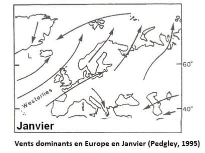 Sous nos latitudes, un vent d'Ouest domine, voire Ouest-Sud-Ouest en hiver lors de la reprise de l'activité dépressionnaire Atlantique.