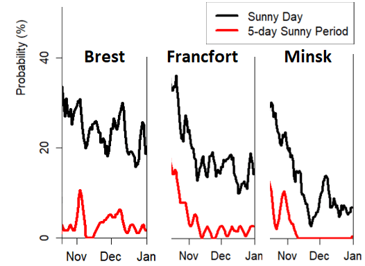 Ces zones peuvent être illustrées avec les graphiques de probabilité d'ensoleillement (probabilité de survenue d'une période ensoleillée de 5 jours consécutifs).