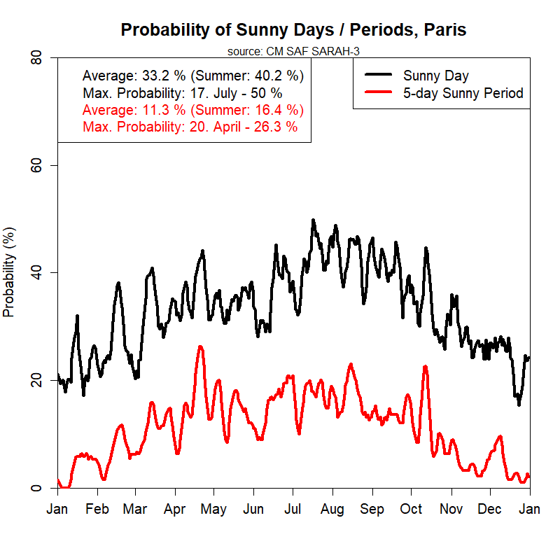 Probabilité d'ensoleillement (>5 jours consécutifs) à Paris - CM SAF data