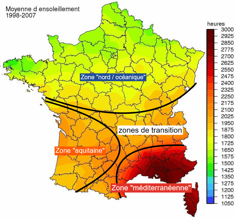 Il existe grossièrement 3 zones d'ensoleillement différentes en France, séparées de zones de transition où les influences se mêlent.