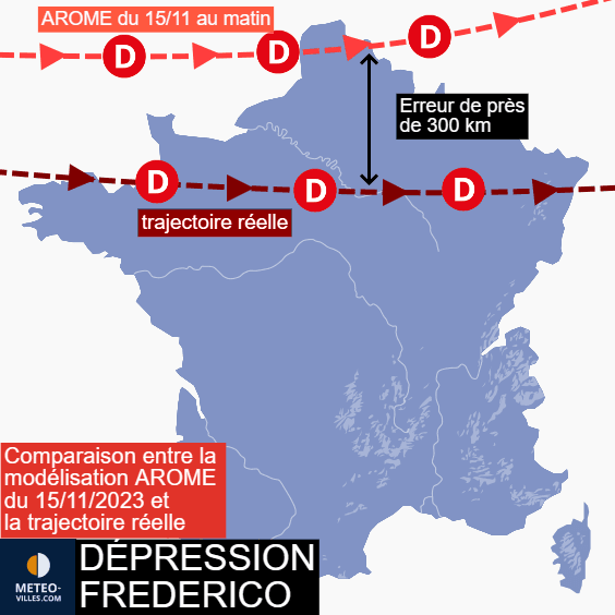 Tout d'abord, il est important de préciser que le creusement d'une dépression n'est jamais aisé à prévoir. Les modèles rencontrent souvent des difficultés à modéliser avec précision la trajectoire et l'intensité de ces dépressions. Cependant, il faut souligner que les performances récentes des modèles Français que sont AROME et ARPEGE ont été très décevantes. En l'occurrence, AROME (le modèle à mailles fines de Météo France) s'est largement trompé sur la trajectoire de la dépression Frédérico. Mercredi matin, il la faisait passer le long des côtes anglaises puis sur la Belgique. 24 heures plus tard, Frédérico est finalement passée entre le nord de la Bretagne et les Vosges, soit près de 300 kilomètres plus au sud.