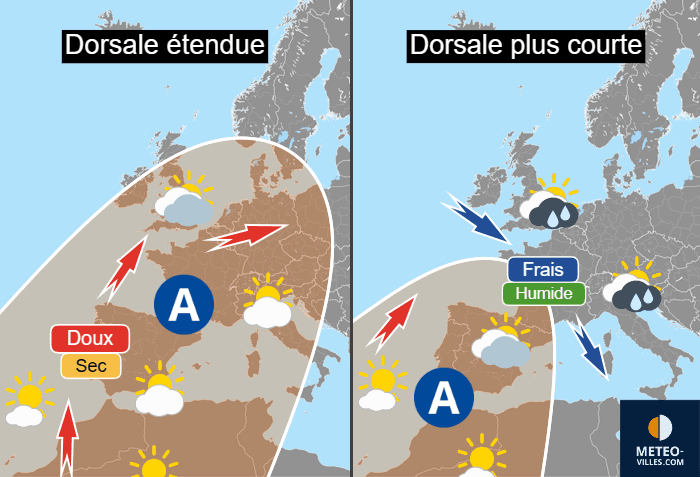 Schéma montrant les différents types de temps en France sous régime de dorsales – Météo Villes