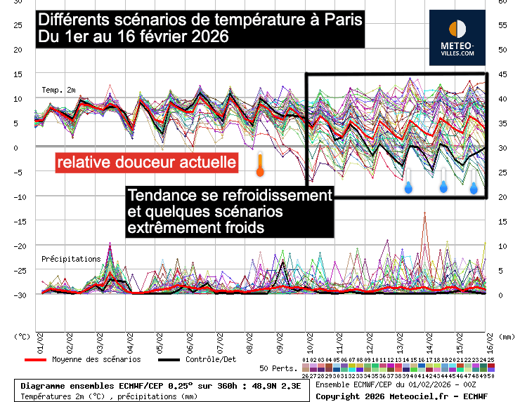 À partir du 9 février, la moyenne générale des scénarios indique une baisse des températures. Cela ne signifie pas nécessairement que nous aurons un coup de froid, car les prévisions de ces derniers jours ont montré que ce refroidissement a été repoussé de jour en jour. Néanmoins, la probabilité que l’air froid bascule sur nos régions est plus forte que l’inverse. Certains scénarios sont même extrêmement froids, et tout reste possible. À Paris, certaines prévisions indiquent des températures en dessous de 0° l’après-midi et jusqu’à -5 à -10°C le matin. Ces simulations ne sont pas si isolées que cela et reviennent régulièrement depuis quelques jours.